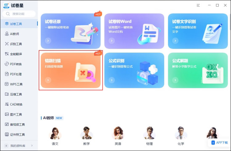 拍试卷是一款一键擦除试卷手写痕迹的软件。它支持多种格式的试卷导入,通过OCR技术识别试卷内容,自动生成错题集。其功能上也是支持种类齐全,试卷文字识别、试卷擦除、PDF转word、图片翻译等等,错题扫描整理是它的特色功能之一
